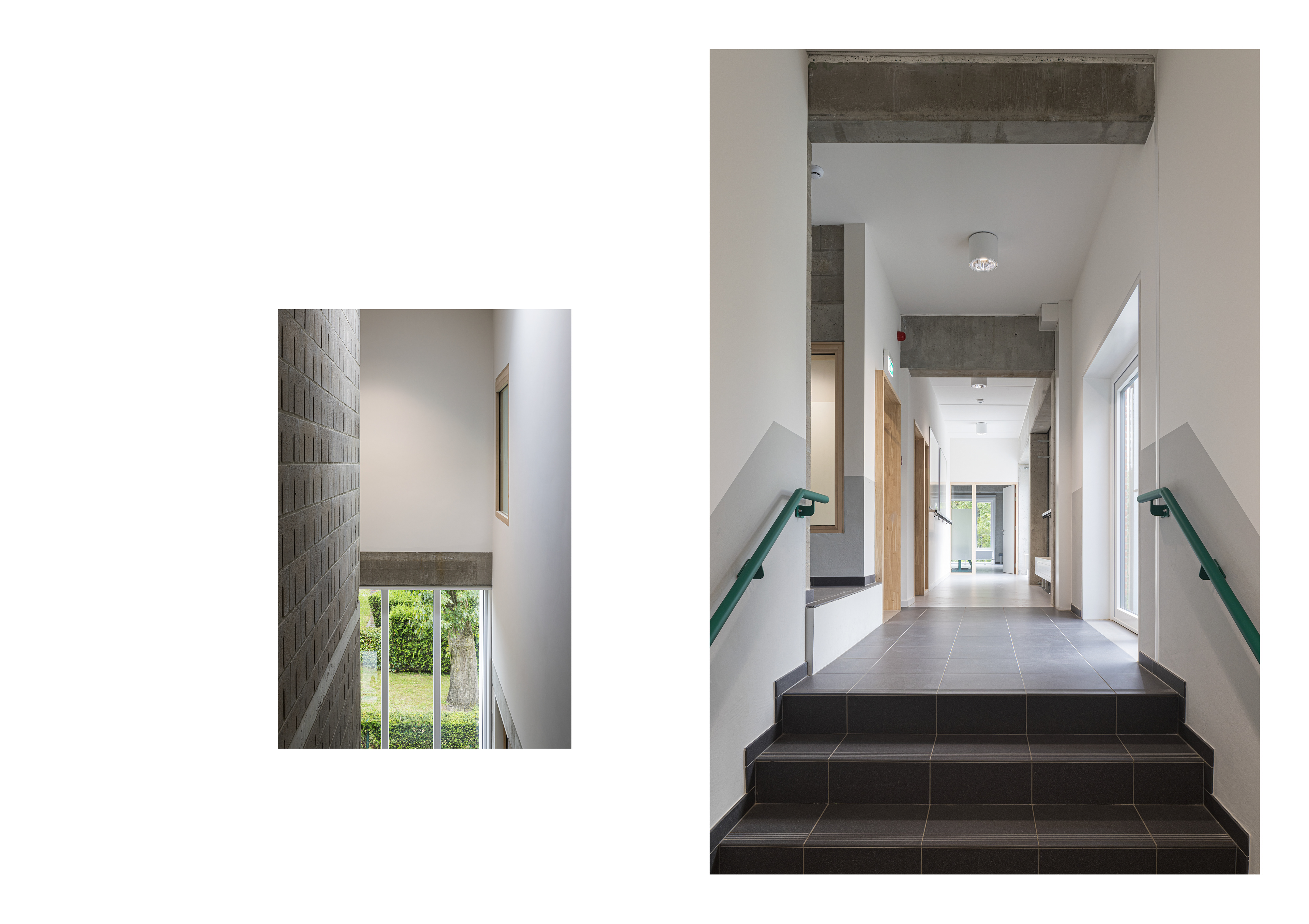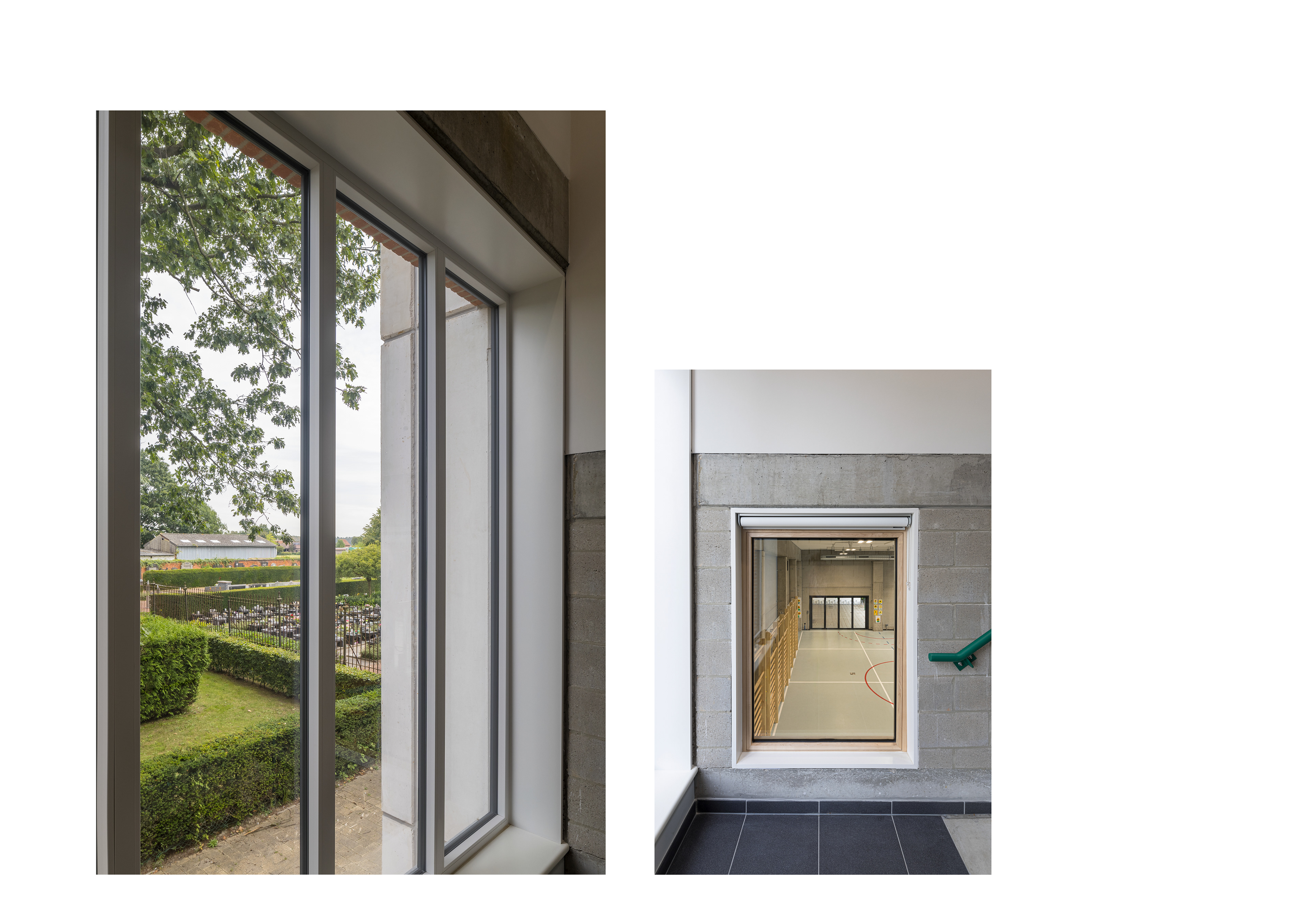 Het ontwerpen van een herdenkingsplaats is uiteraard heel bijzonder maar ernaast bouwen heeft toch ook iets speciaal. Het project ZOV.t gaat over de herwerking van een kleine schoolcampus waar aan de kant van het kerkhof een nieuwe turnzaal met daarboven 2 klassen zijn geprogrammeerd. We respecteren de rust van begraafplaats door de straatgevel van de zaal gesloten te houden. De bovenbouw geven we een klassieke en serene opbouw die geen aandacht vraagt. De grote raamvakken kunnen wel een herinnering oproepen aan de kleine opbergvakjes op het terrein ernaast. De kleuren zijn niet opvallend en gaan op in het geheel. Tussen de nieuwbouw en het bestaande schoolgebouw plaatsen we een bijkomende traphal waarin we heel verzorgd de kenmerken steken van de oorspronkelijke bouwfase. Zo erkennen we ook ons gebouwd verleden.